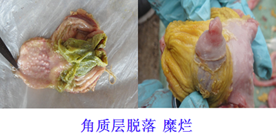 谷鳳柱教授還說,肌胃炎多和腺胃炎同時(shí)發(fā)生,但也可單獨(dú)發(fā)生,且對雞的危害大于腺胃炎。由于病因不同,臨床肌胃角質(zhì)層的病理變化也不盡相同。臨床上經(jīng)??吹郊∥附琴|(zhì)層的糜爛、崩解一定是發(fā)生了肌胃炎,但角質(zhì)層沒有糜爛不一定不是肌胃炎,要認(rèn)真辯證分析。如果發(fā)現(xiàn)角質(zhì)層已經(jīng)發(fā)生褪色、變淡,那么我們就應(yīng)該注意了。